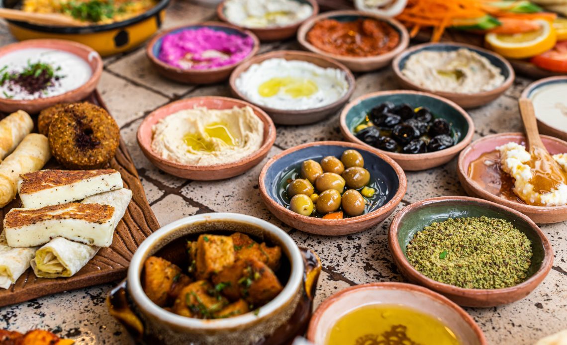 - Mezze and salads prepared just before serving